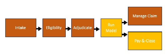 For example, the diagram below illustrates a pay-&-close process being assisted by an analytical model that recommends which claims should be handled through this process, and which should be managed conventionally.